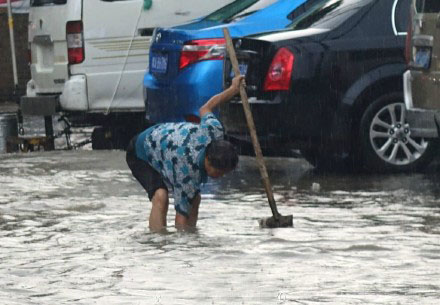 昨天下午,鄭州突降大雨。客技路中段,有200多米道路被雨水淹沒,積水最深處已經到腿肚。一位大媽冒著暴雨在積水中清理下水口附近的垃圾,試圖讓水流得更快一些。