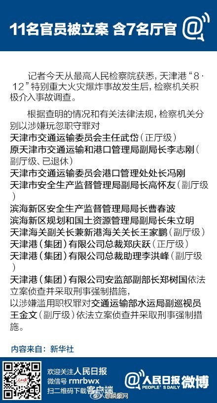 天津交通委主任武岱(正廳)、原天津交通運輸和港口管理局副局長李志剛(副廳、已退休)、天津安監局副局長高懷友(副廳)、天津海關副關長王家鵬(副廳)、天津港集團總裁鄭慶躍(正廳)、總裁助理李洪峰(副廳)、交通部水運局副巡視員王金文(副廳)。