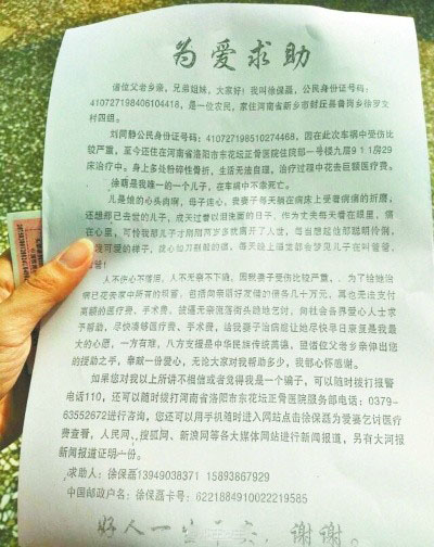近日,有網友發微博稱,鄭州火車站候車廳,有個自稱徐保磊的人向旅客挨個散發傳單,稱妻子因出車禍住院無錢治療,向旅客乞討求助。經多方調查:當事人已出院兩年多,發傳單的不是徐保磊本人。大家不要上當啊!