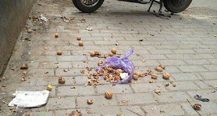 8月26日,鄭州互助路某家屬院忽然天降一包核桃,險些砸中買菜回來的王女士。接到王女士求助后,巡防隊員急忙上樓查看高空拋核桃的居民,沒有一家開門說明情況。據了解,該小區之前也有居民反映高空拋物現象。