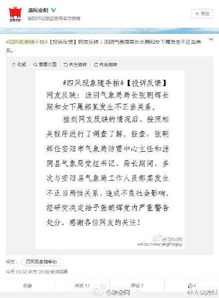 以往不少"性丑聞"官員都被查出貪腐問題。不妨順藤摸瓜,查一查張朝輝是否存在其他問題,給民眾一個交代。同時,張朝輝今年初剛被任命為湯陰縣氣象局長,尚在1年試用期內。既然出了如此影響惡劣的丑聞,組織上有必要對其任職資格和條件,重新進行評估。