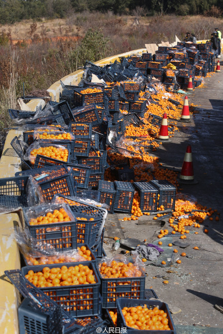 13日凌晨4時(shí)許,一輛滿載桔子的大貨車行經(jīng)昆明市東繞城高速公路時(shí)側(cè)翻,近30噸桔子灑落一地。數(shù)十村民貓著腰來(lái)揀桔子,有的拿筐,有的提袋…現(xiàn)場(chǎng)施救人員說(shuō),有些開(kāi)車來(lái)?yè)專祹讉€(gè)來(lái)回了。駕駛員說(shuō),那些桔子破損嚴(yán)重,揀回來(lái)也不容易。