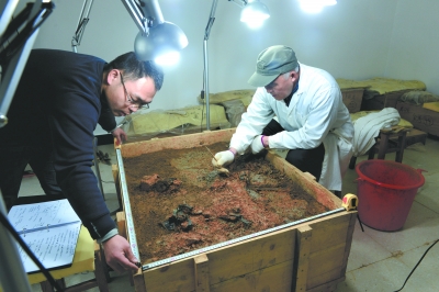 考古現場在緊張有序地準備主棺柩吊運,實驗室則在有條不紊地對先前發掘的文物進行考古,主棺吊運、文物清理保護兩不誤。這幾天,在文保用房里, 工作人員正在對偶車馬進行清理記錄。據悉,清理中的偶車馬是先前在主墓甬道中發現的。工作人員在做每一層清理時,都會留下豐富的資料,包括影像拍攝、文字 記錄、圖表繪制等。偶車馬的清理發掘,對研究西漢列侯出行制度有很大參考價值。