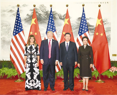 11月9日,國家主席習近平在北京人民大會堂東門外廣場舉行歡迎儀式,歡迎美利堅合眾國總統唐納德·特朗普對中國進行國事訪問。這是習近平和夫人彭麗媛在人民大會堂同特朗普夫婦合影。