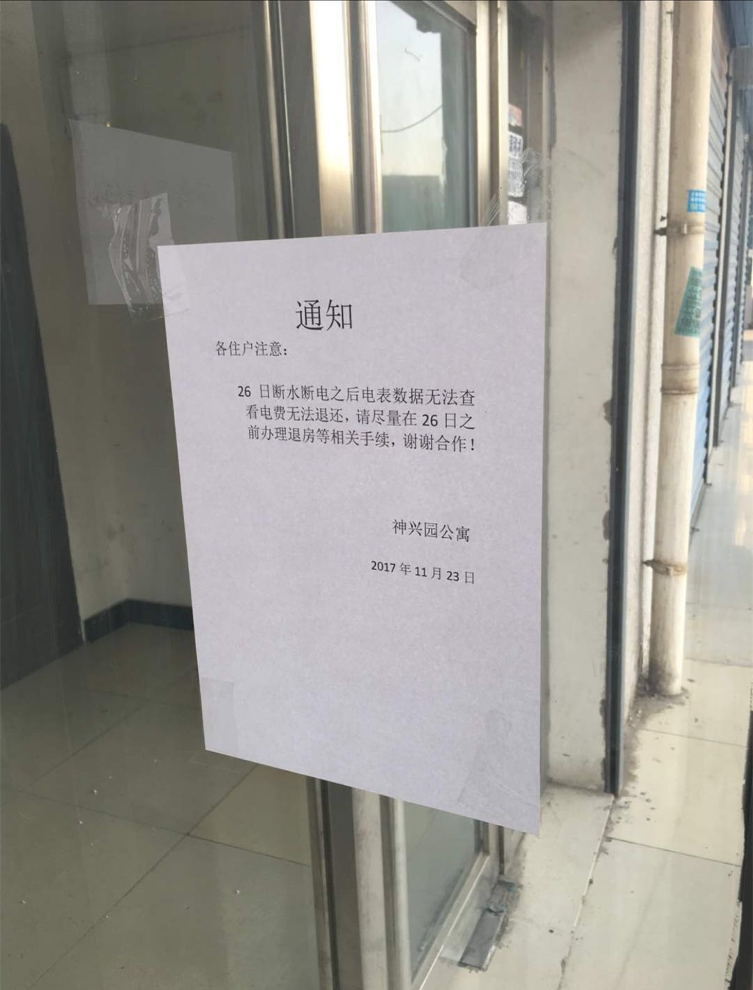(根據(jù)通州臺(tái)湖鎮(zhèn)政府下發(fā)的通知,亦園青年創(chuàng)業(yè)園周邊5家公寓應(yīng)于11月26日全面停水停電,圖為5家公寓之一的神興園公寓的通知 饒賢君/攝)