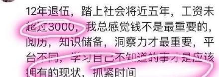 12年退伍,在社會上5年,工資未超過3000元,但是感覺錢不是最重要的,只是儲備,洞察力才重要,學習自己不知道是才是應該有的狀態。