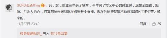 95年,創業三年買了輛車,今年買了市區中心的商業房,現在全國排,旅游。月收入一萬+,打算明年定居鳳凰哪里開個客棧,現在的著寫我都不敢想我是吃了多少苦才換來的。