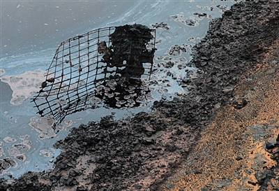 在一些洼地,可以看到一根根直接插入沙里的黑色橡膠管道,這些管道周邊的細沙呈黑色。踢開表面,下面是散發著臭味的黑色凝結物。