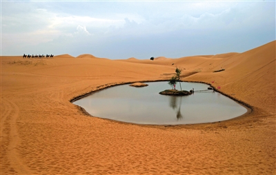 騰格里沙漠深處有一小湖泊,被開發成旅游景點。不過,由于地下水開采加劇,這個湖泊越來越萎縮。