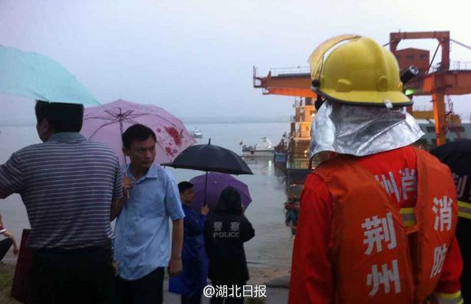 6月2日,消防救援人員在事發(fā)現(xiàn)場。 6月1日晚,一艘從南京駛往重慶的客船“東方之星”輪在長江中游湖北監(jiān)利水域突遇龍卷風(fēng)發(fā)生翻沉。事發(fā)客船共有458人,其中旅客406人。圖為目前客船已沉入江中,呈倒扣狀,給救援工作造成極大困難。(楊宏斌、王馨、田悅)圖片來源:《湖北日報(bào)》官方微博
