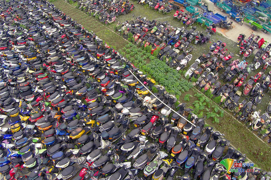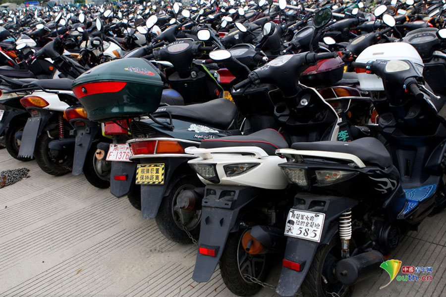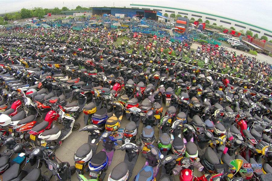 2015年6月4日,超寬、超速、非法營運三輪電摩及各種摩托車密密麻麻重重疊疊地堆積在一起,從高空中俯瞰場面震撼。這不只是杭州一家報廢車停車場的情景,幾乎每家停車場都如此。工作人員說,這都是交警執法過程中收繳的。工作人員跟記者抱怨說,電摩停放時間太長,再不拆解都停不下了!據負責人介紹,杭州自禁摩托車以來,總有一些違規者偷偷地利用摩托車充當黑摩的。此舉既不安全,也暗藏各種不安全因素。2014年,杭州有204人死于涉及電瓶車的交通事故;在所有交通事故中,涉及電瓶車的占到四成以上。3月25日,有杭州媒體報道,杭州收繳的電動車已堆滿停車場,據估算馬路上還有百萬輛以上超標車。(金童子/攝)