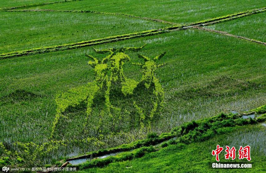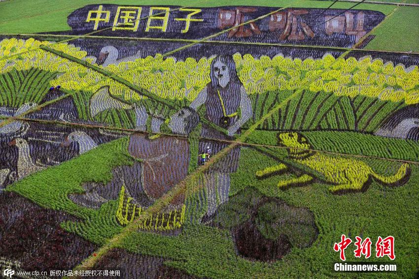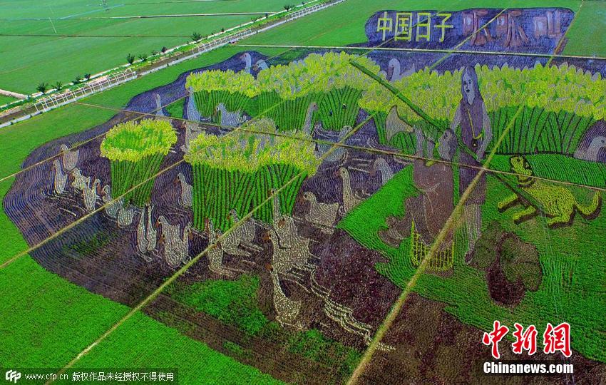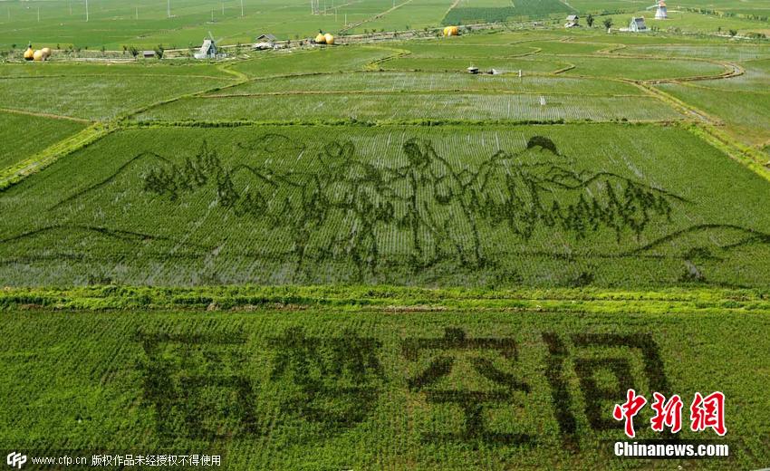 2015年6月22日,遼寧省沈陽市,總占地面積150畝的巨幅稻田畫《中國日子 呱呱叫》、《中國夢 幸福起航》、《小夢露》等十三幅“3D稻田畫”正式亮相沈陽沈北新區興隆臺錫伯族鎮。據了解,錫伯族有種植稻田畫祈福的傳統,稻田畫先設計好要表現的圖形,利用先進的3D技術和透視技術,用矢量法定點定樁連線人工填色,種植不同品種有著不同顏色葉子的水稻,繪制出平面,立體,嘍空,線條四種不同風格稻田畫。田衛濤 攝 圖片來源:CFP視覺中國