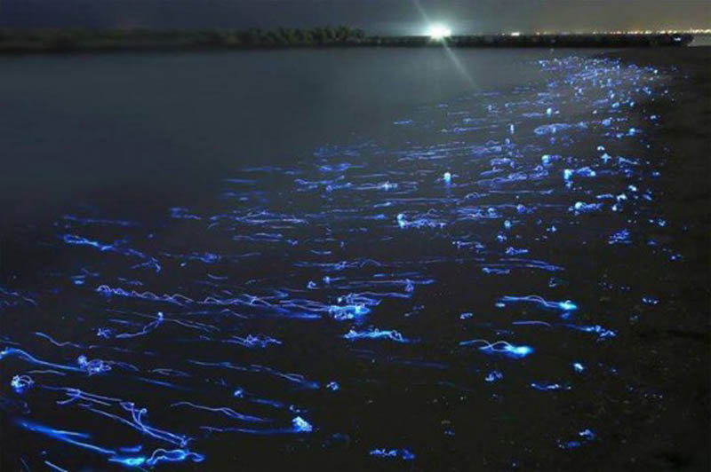 熒光烏賊是海洋中神奇的發光生物,通常只有7厘米長,具有復雜的表皮發光器和眼球發光器。在日本富山灣海下三四百米深的海溝中棲息著大量熒光烏賊,他們的一生大部分時間生活在海底,每年的3月至6月浮到海面產卵。每年這一時節的夜晚,聚集在富山灣沿岸的熒光烏賊協調一致地發出藍光,將整個海岸點亮,如夢如幻,成為富山灣獨特的風景,吸引著眾多游客前來欣賞。