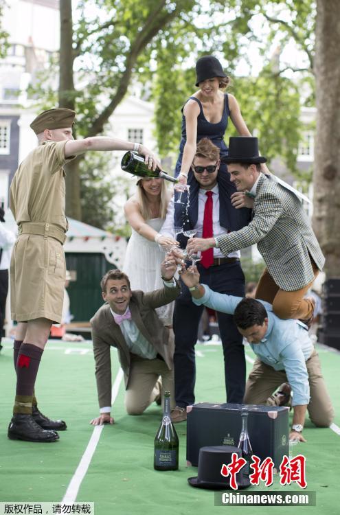 當地時間2015年7月11日,英國倫敦,貝德福德廣場花園舉辦一年一度的“紳士運動會”。這是一個不以打破記錄為榮,而專為紳士打扮裝帥耍酷而設的趣味運動會,比賽項目包括“雨傘騎(車)斗”、“燙衣板沖浪”、“背人賽跑”等,現場參加者不一定會出汗出力,但一定要打扮成傳統紳士淑女風格,而叼煙、小酌一杯的鏡頭更讓人覺得這是一場嘉年華。