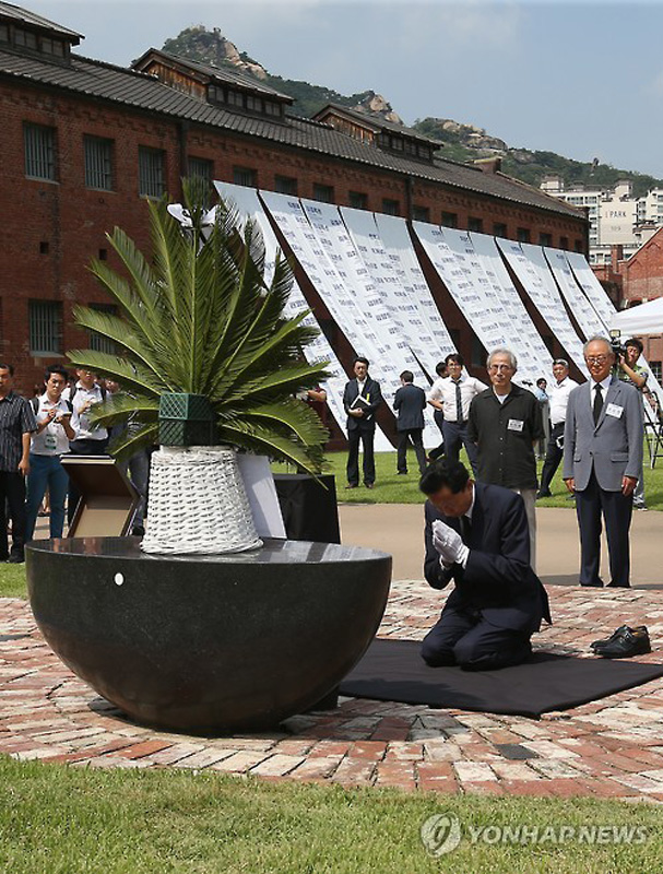 當地時間2015年8月12日,正在韓國訪問的日本前首相鳩山由紀夫參觀了首爾“西大門刑務所”博物館,并在追悼碑前跪地禱告。據悉,西大門刑務所始建于1908年,用于關押反抗日本殖民統(tǒng)治的韓國抗日義士。鳩山由紀夫表示,日本理應承認殖民侵略歷史。(圖片來源:網絡)