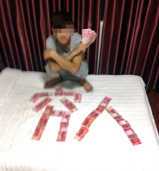 在小偷鄧某隨身帶的手機里,警察還意外發現了兩張照片,是一名男子和用100元人民幣擺成的“窮人”、“窮不”的字樣的合影。經過民警詢問得知,照片上的男子是鄧某的老鄉唐某,這些錢是他第一次行竊的時候偷來的,總共有5100元。由于第一次一次性竊得這么多錢,兩人欣喜若狂,在居住的旅店內把百元大鈔盡情的“秀”了一把。警方則根據照片上的線索順藤摸瓜,在廣東將唐某逮捕。