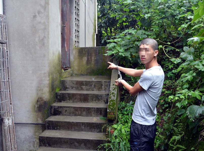 陳警官介紹,鄧和唐都是重慶市榮昌縣人,父母都在外地打工,因和家里有矛盾,唐某帶著1000元錢和鄧某回到了重慶,本來準備找份工作,但1000元很快花完了,也沒有找到像樣的工作,于是就起了賊心。鄧某和唐某第一次偷盜的金額就有5100元,對他們來講已經算是巨資,所以才想著拍照“留念”。圖為唐某指認現場。