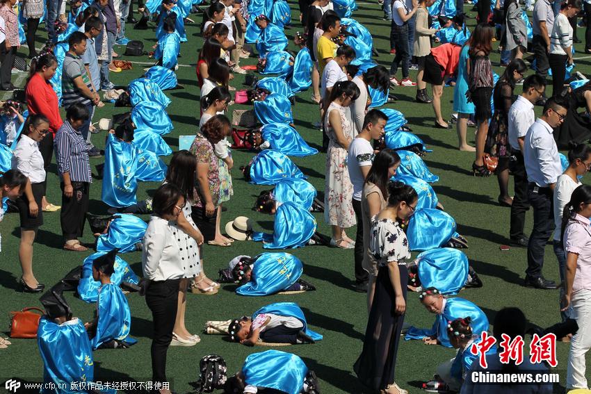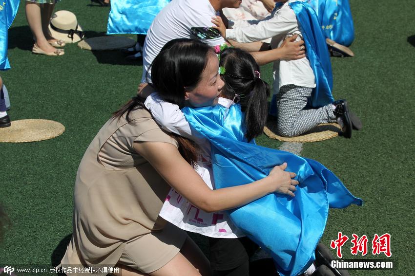 2015年9月10日,江蘇南通,北城小學舉行“點亮成長中的每個日子”大型入學儀式,532名新生和家長一起參加“感恩禮”、“拜師禮”和“開筆禮”等獨具特色的新生入學禮,讓學生體驗傳統禮儀,將好學、尊師孝親等中華傳統美德融入到學習和生活中。圖為一年級學生跪在蒲墊上行感恩禮,與父母擁抱。 圖片來源:CFP視覺中國