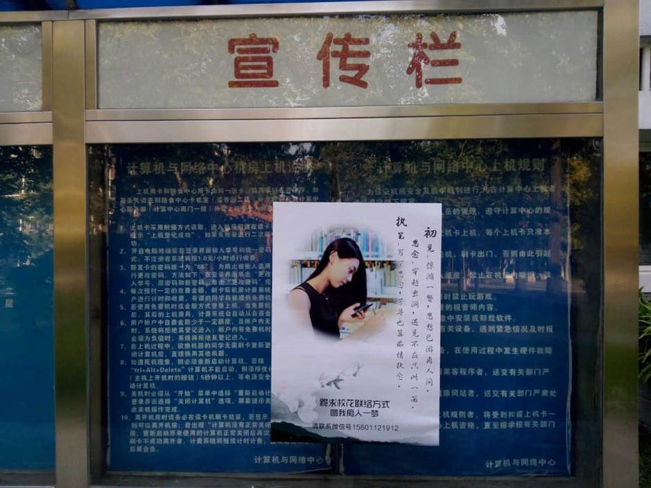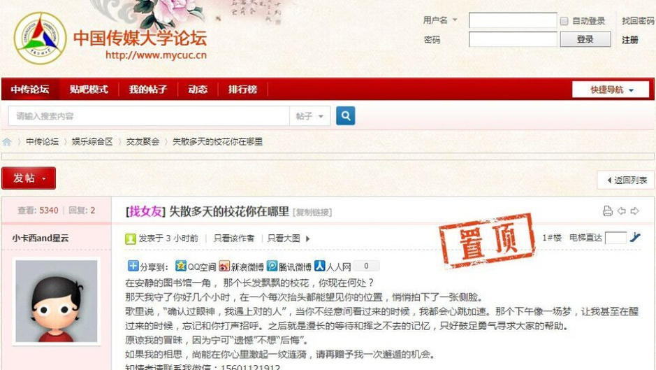 2.   正值開學季,中國傳媒大學驚現癡情男,張貼了數百張海報只為表白校花,據照片顯示,海報中有女孩側臉照片,還留下男生的聯絡方式,甚是精細。
