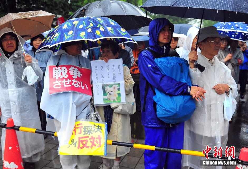 隨著安倍陣營強推以解禁集體自衛權為核心內容的安保法案最終過關的計劃進入“倒計時”,日本民眾的反安保抗議活動再度進入高潮。在之前徹夜抗議之后,9月17日白天,又有眾多日本民眾冒著大雨持續聚集在國會周邊進行抗議活動。中新社發 王健 攝
