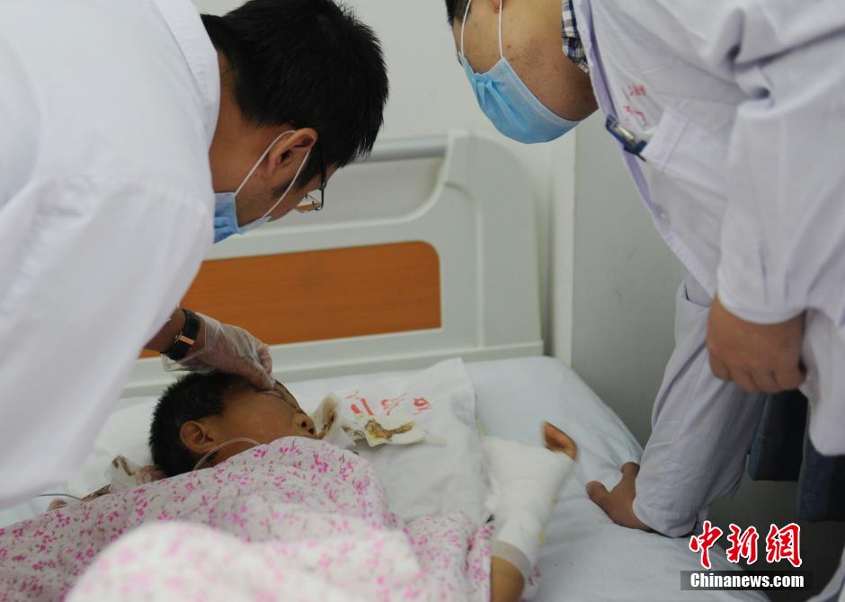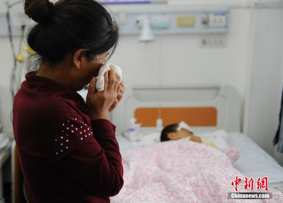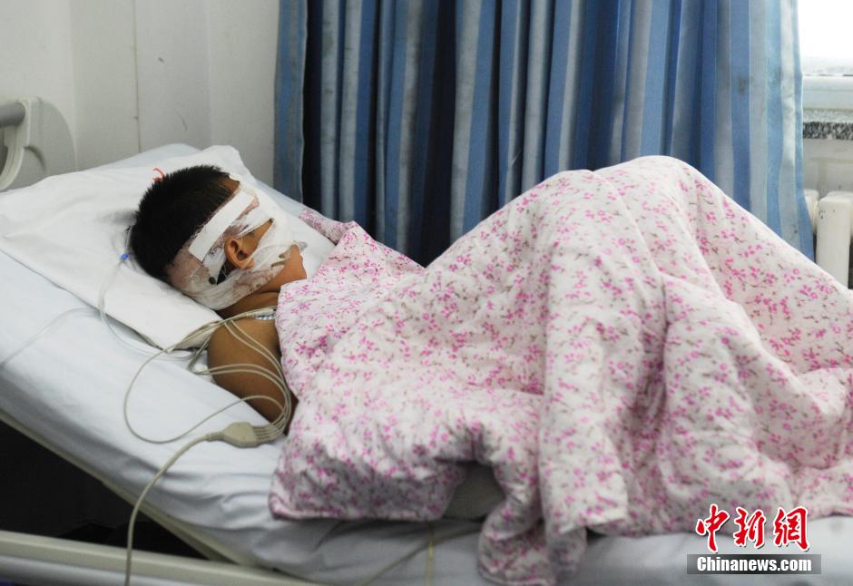 10月13日,12歲的朱某正在吉林大學第二醫院接受治療。據其家人介紹,10月11日,朱某獨自在家,遭同村村民王某挖出雙眼,行兇者還點燃了他家的房子,朱某靠裝死逃過一劫。王某事后自殺。目前雖經手術治療,但朱某右眼視力已無恢復的可能,左眼亦不樂觀。警方正對此案進行調查。中新社記者 張瑤 攝