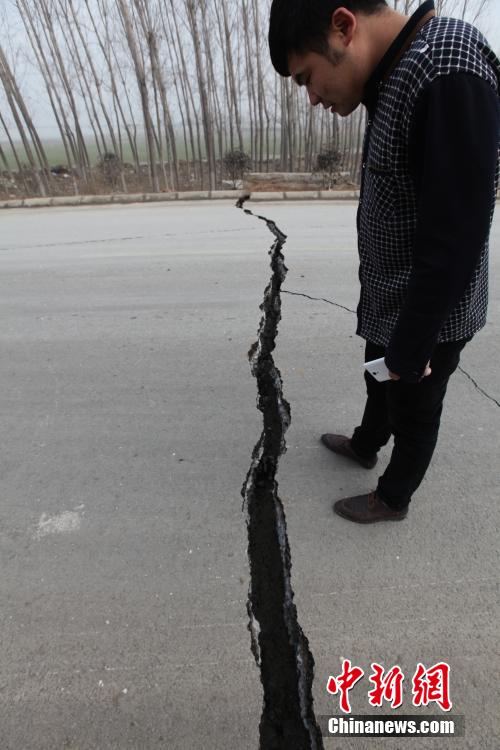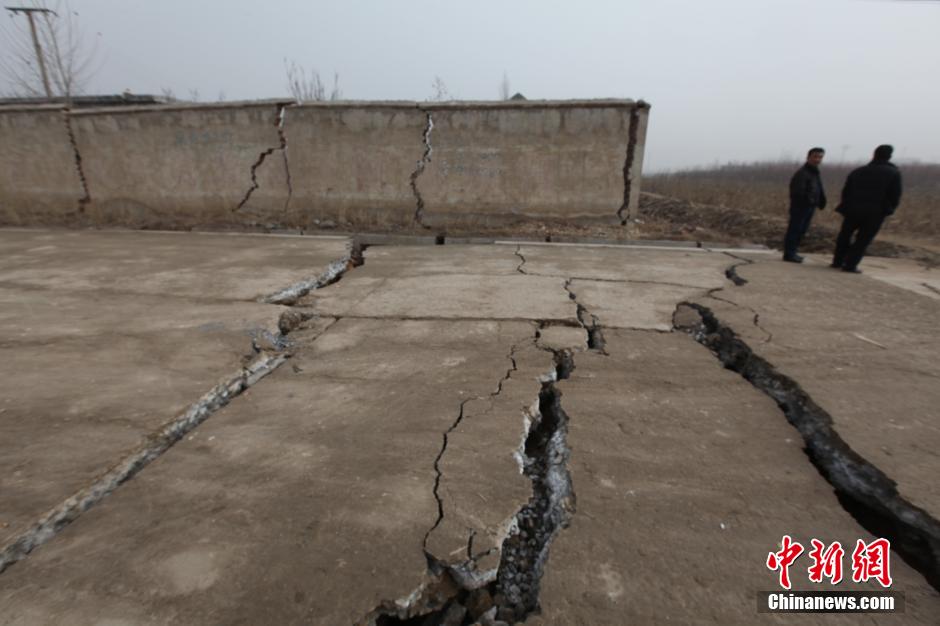12月25日,山東平邑,位于平邑縣保太鎮(zhèn)的玉榮商貿有限公司石膏礦發(fā)生坍塌事故。圖為因塌陷開裂的道路。視覺中國供圖
