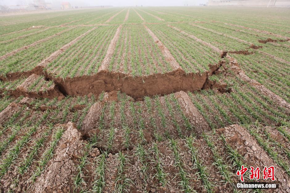 12月25日,山東平邑,位于平邑縣保太鎮(zhèn)的玉榮商貿有限公司石膏礦發(fā)生坍塌事故。圖為礦區(qū)塌陷的麥田。視覺中國供圖