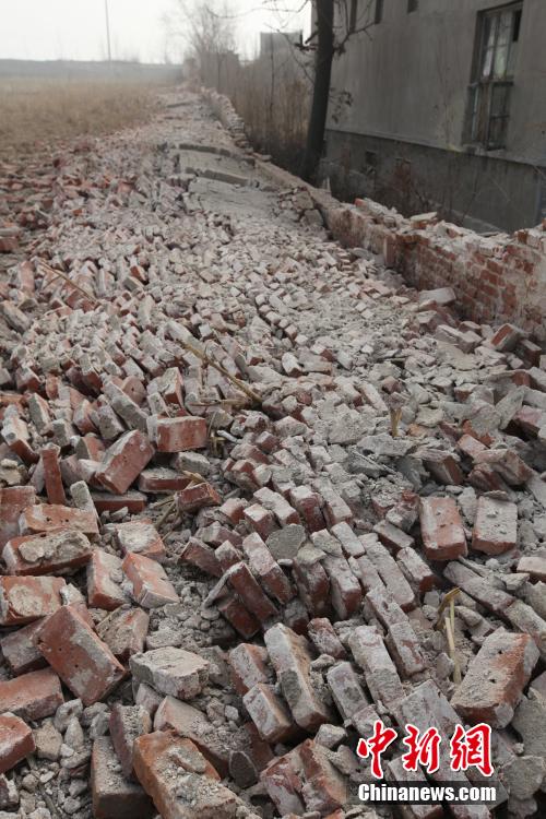 12月25日,山東平邑,位于平邑縣保太鎮(zhèn)的玉榮商貿有限公司石膏礦發(fā)生坍塌事故。圖為倒塌的院墻。視覺中國供圖