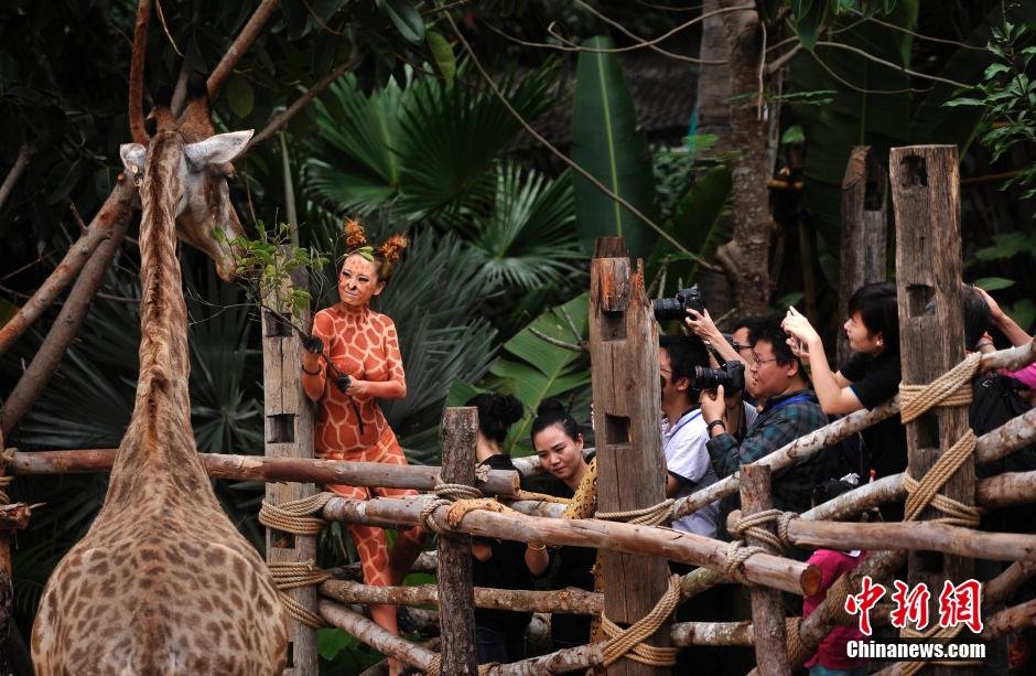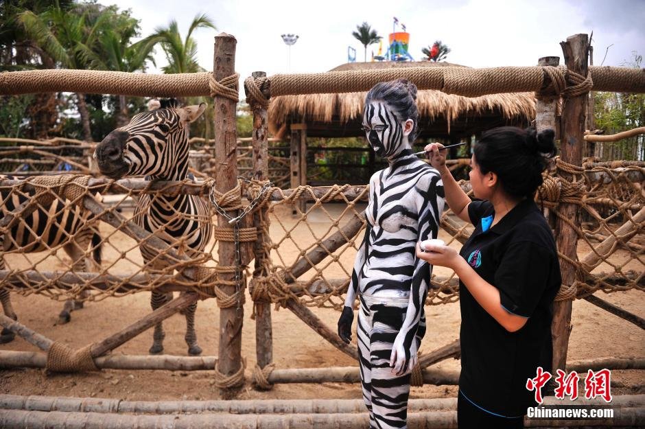 2.   1月10日,三亞彩色動物園上演了一場真實版“美女與野獸”,數10名美女通過人體彩繪裝扮成老虎、斑馬、豹子、長頸鹿、孔雀、鸚鵡、火烈鳥等動物,并與動物園的野生動物一起互動,吸引不少游客觀看。 陳超 攝