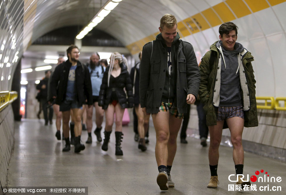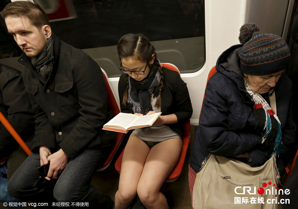 2.   當(dāng)?shù)貢r間2016年1月10日,捷克布拉格,“地鐵無褲日”當(dāng)天,乘客穿短褲乘車。圖片來源:視覺中國