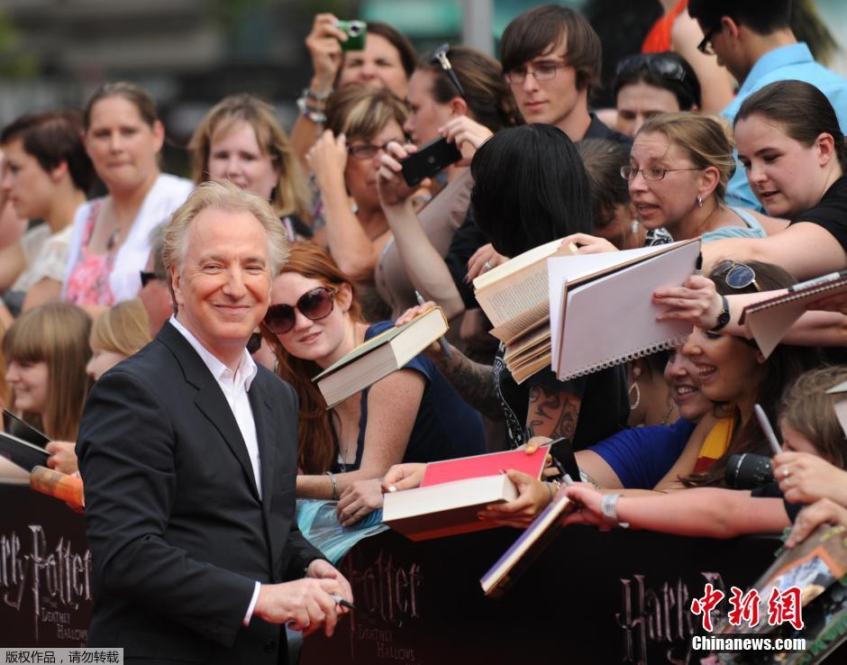 圖為2011年7月11日,電影《哈利·波特與死亡圣器2》在紐約林肯中心舉行首映式,阿倫·瑞克曼(Alan Rickman)現(xiàn)場為粉絲簽名。
