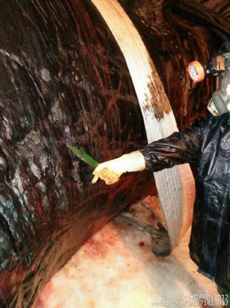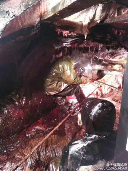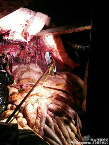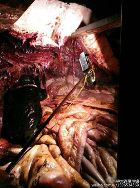 2016年2月14日至15日,江蘇如東洋口港海灘先后發(fā)現(xiàn)兩條抹香鯨擱淺死亡。19日,技術(shù)專家開始抹香鯨的開腹工作,其中一位專家進(jìn)入了抹香鯨的體內(nèi),在工作之時拍下了體內(nèi)的情況。