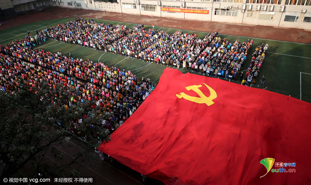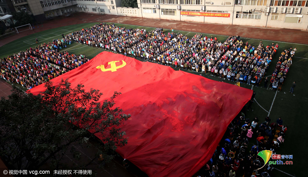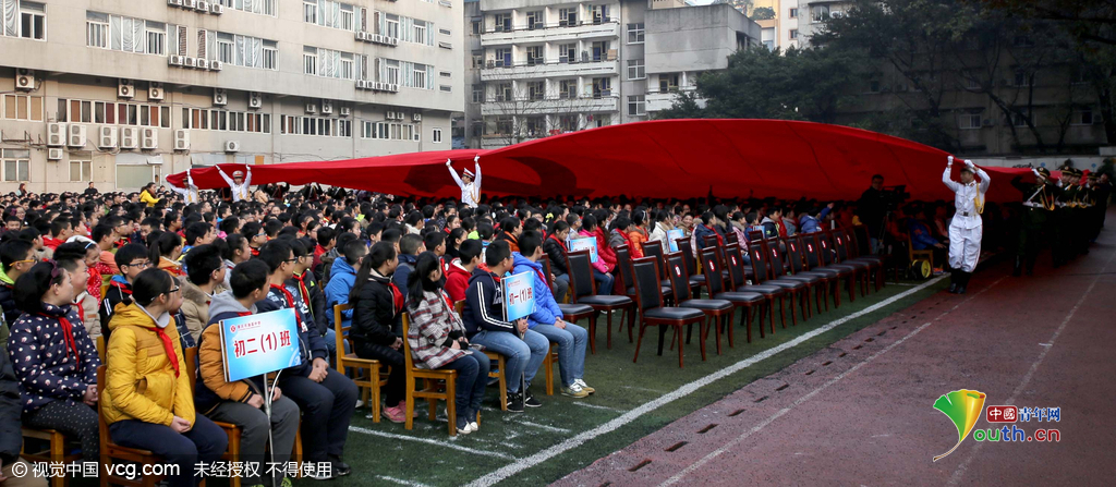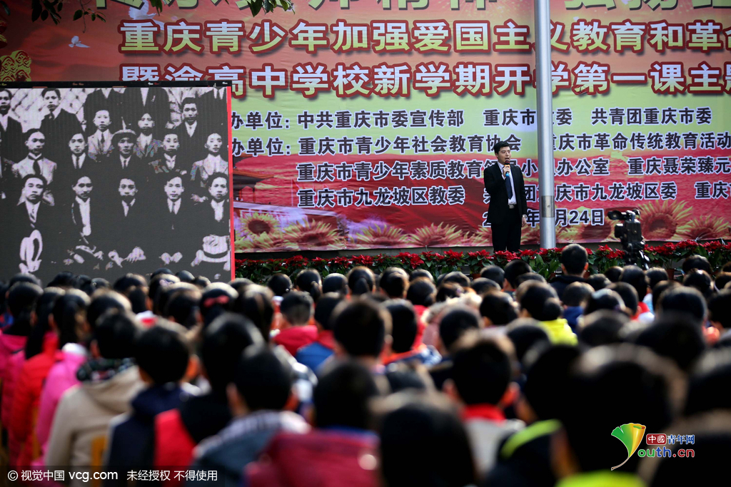 2016年02月24日,重慶市新區,渝高中學,開學典禮上同學們傳遞一面90米寬的巨大黨旗。開學第一課由聶榮臻元帥陳列館報告團成員為同學們宣講老一輩無產階級革命家的豐功偉績。視覺中國