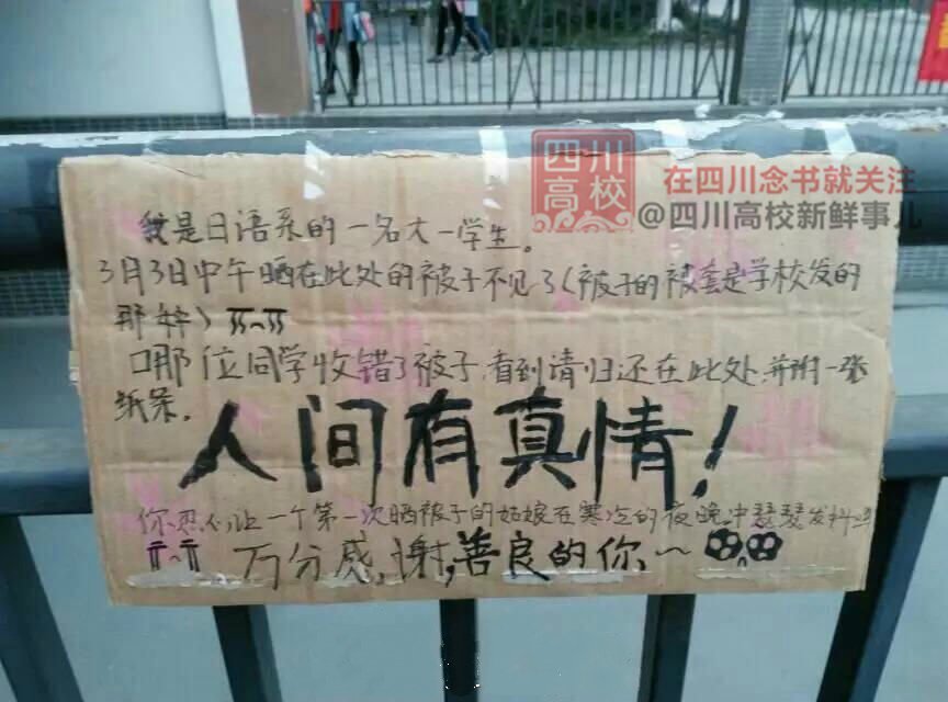 近日,四川外國語大學成都學院一女生在校內曬的被子被其他同學誤拿,這位女生通過“人間有真情”海報、一系列“請往右看”便簽來定位一床沒人收的被子,以此尋找拿錯被子的同學。這個萌辦法讓網友紛紛點贊。