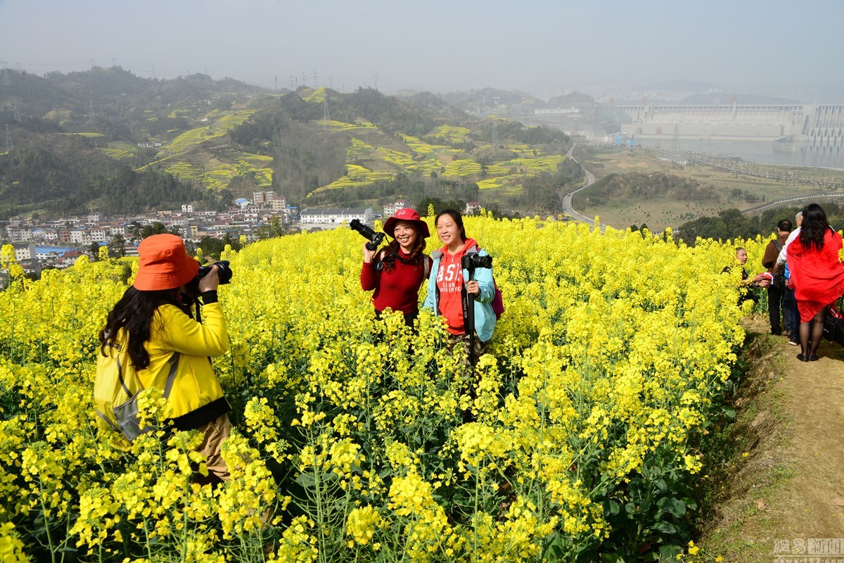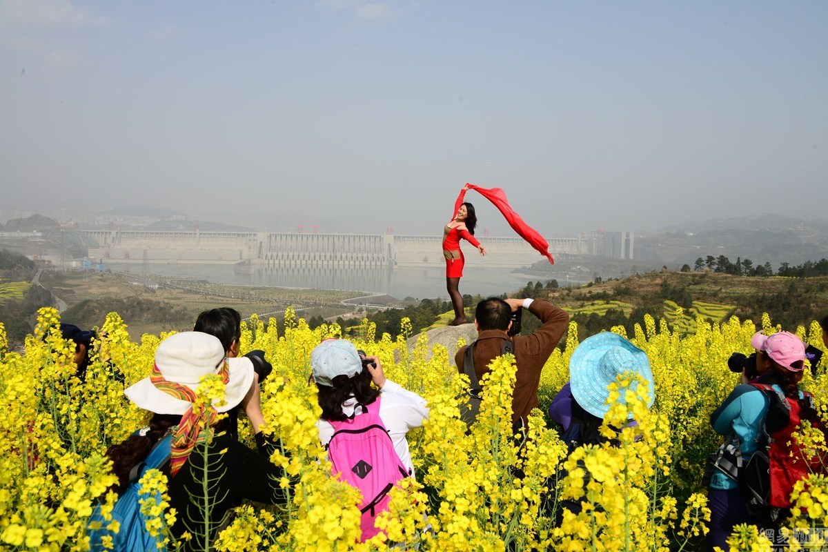 2016年3月6日,湖北宜昌,隨著春季氣溫的回升,湖北宜昌三峽壩區高家溪油菜花絢麗綻放,把三峽大壩映襯得分外壯觀美麗,吸引了眾多攝影發燒友和游人前來踏青采風游覽。當天一位練瑜伽的大媽陶醉于壩前花海,秀起了瑜伽,一時吸引了攝影發燒友和游人瘋狂拍攝。圖為大媽花海中秀瑜伽。