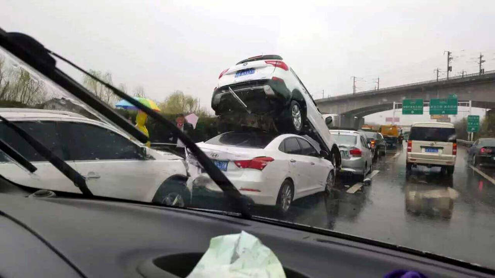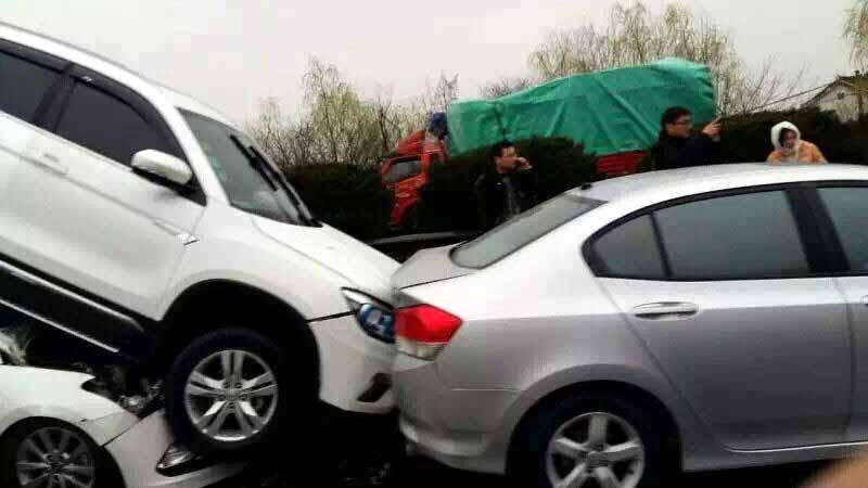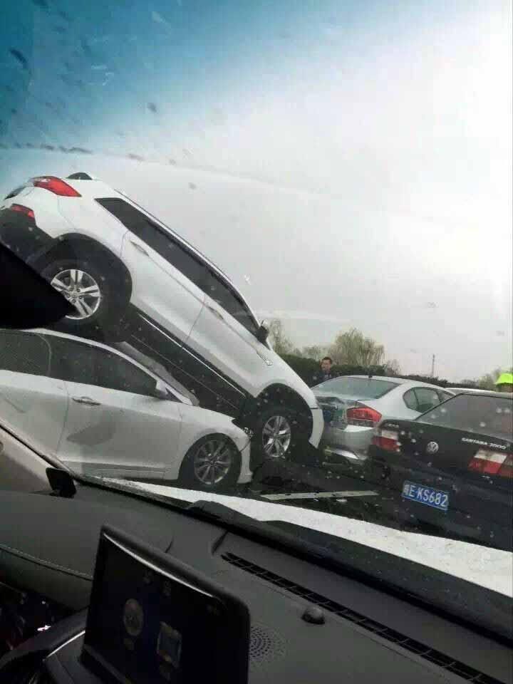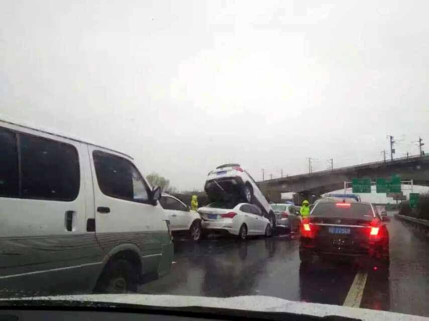 2.   3月8日早上,受寒潮影響,南京雨水不停,寧馬高速南京方向的板橋附近,發生九車連環相撞事故,其中一輛SUV被后面追尾的轎車完全頂起,造成道路擁堵。目前,事故原因交警仍在調查中。