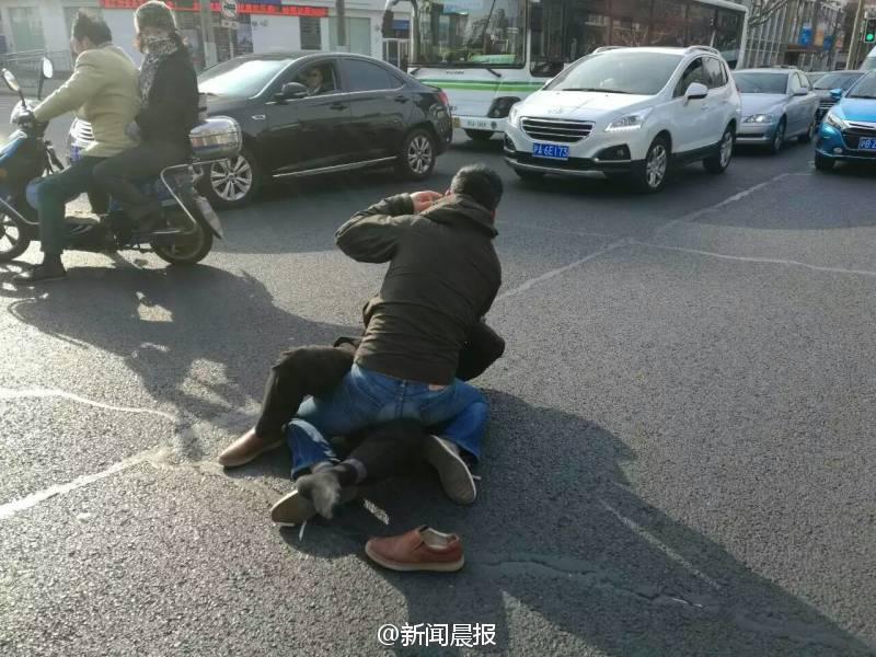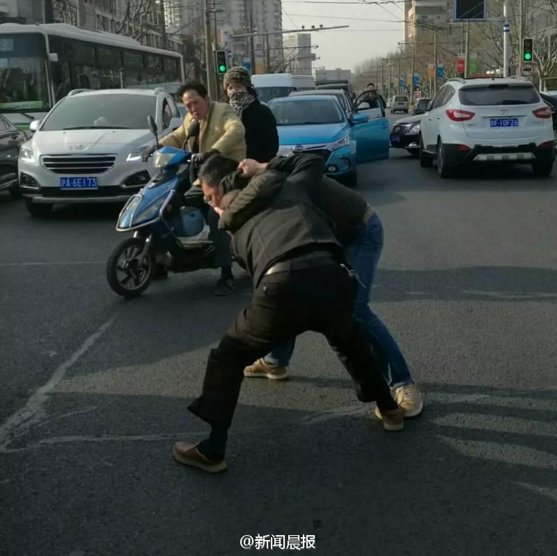 晨報訊 你一個過肩摔,我一個橫掃腿,接著扭打在一起,互相纏斗難分伯仲……這幕刺激的武打動作場景,昨天早高峰時在上海安波路營口路上演,而沖突竟源于“路怒”!目擊者肖先生告訴記者,昨天上午8點不到,他經(jīng)過安波路、營口路路口時,看看兩名男子扭打在一起,場面十分激烈。“我順勢拿出手機(jī)拍了幾張照片,旁邊也有行人上去勸架。”肖先生說,在兩名男子的身旁,一橫一豎停著兩輛轎車,“我想可能是兩個人開車有點摩擦引起的‘路怒’吧。”