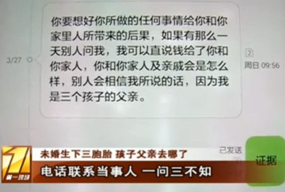 根據(jù)馬先生提供的三胞胎出生證明,孩子父親一欄中寫的就是呂先生的名字,就是這個(gè)公司的總裁,兩個(gè)人的短信記錄上,呂先生也承認(rèn)這三個(gè)孩子的身份。為了進(jìn)一步核實(shí)情況,記者也聯(lián)系上這位呂先生。但對記者問什么,馬先生都說不知道。