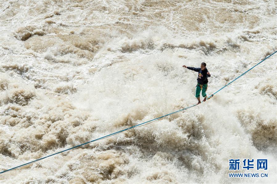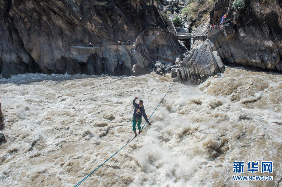 4月26日,張亮在扁帶上行走。當日,在云南香格里拉的長江天險虎跳峽上,“中國扁帶第一人”張亮利用寬度只有2.5厘米的扁帶,在距離江面16米的高度上成功行走60米,耗時5分58秒抵達虎跳峽香格里拉一側的終點完成挑戰。