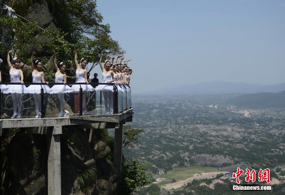 2.   5月16日,眾多身著芭蕾舞服的舞蹈愛好者來到湖南平江石牛寨,在音樂玻璃棧道和懸崖邊跳起了芭蕾,高難度的舞姿吸引了眾多游客圍觀。 楊華峰 攝