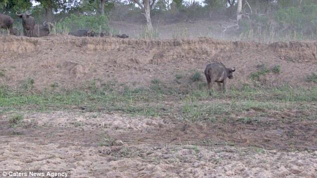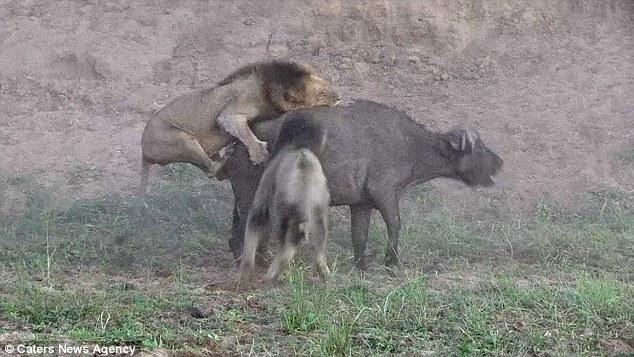 這組影像的記錄者是南非動物保護區的一位職業向導。它表示,這只機智的水牛被兩群獅子前后夾擊,被困在包圍圈里。