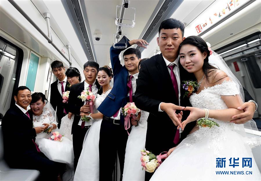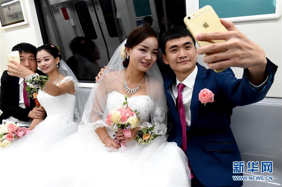 8月9日,新人們在鄭州地鐵2號線一期列車上自拍。