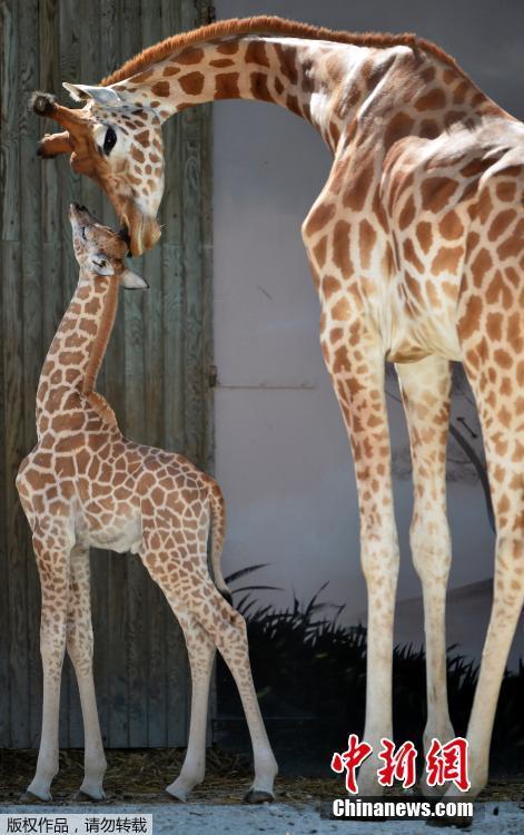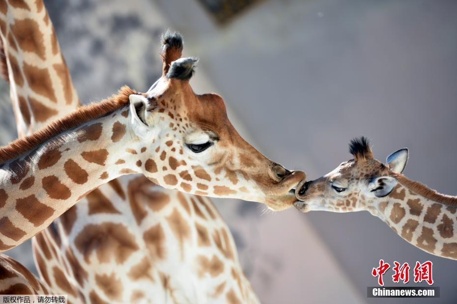 近日,法國 La Fleche,12歲的南非長頸鹿Dioni誕下可愛寶寶Kenai。攝影師記錄了出生才幾天的小長頸鹿和媽媽的親昵瞬間。圖為Kenai正在親吻母親。