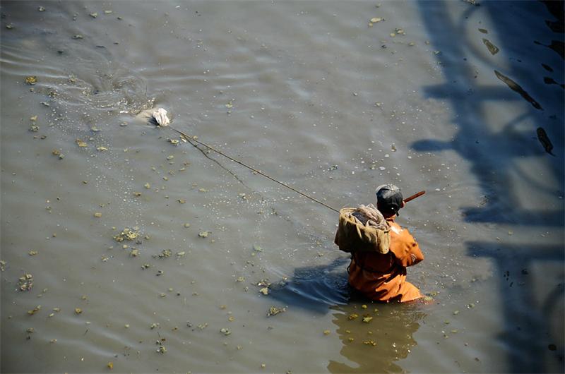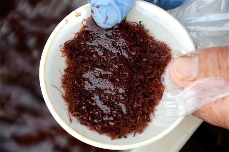 仔細觀察才發現男子們都身穿連體防水衣,在蹲在發臭的河水中,將網撒到河底后左右攪拌,河底的淤泥被攪了上來,河水立刻變得非常渾濁,搖晃漁網篩去淤泥后,把剩下的紅線蟲倒入塑料袋中。