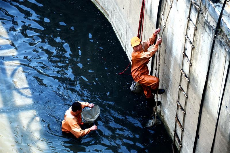 據了解,近期小清河開閘防水,河道水深不足1米,這幾名男子從河岸上放下軟梯,進入河中捕撈紅線蟲。