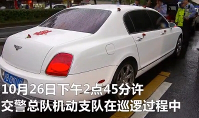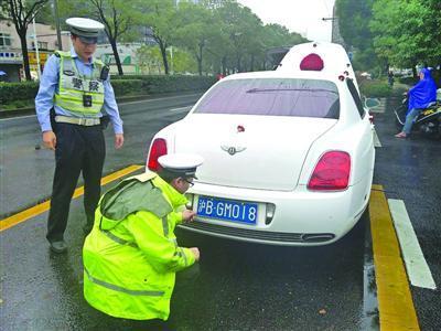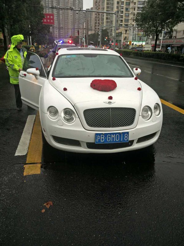 下午2點45分許,上海交警總隊機動支隊巡邏時,在周家嘴路近大連路處發現一路婚車車隊,共計5輛車,其中領頭的是懸掛“滬BGM018”牌號的白色賓利歐陸跑車。后經查實,此車為套牌車。