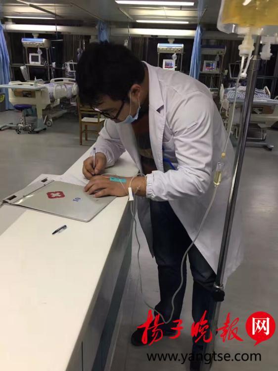 10月29日,一位身穿白大褂帶著口罩的男醫生,一邊打點滴,一邊為病人下醫囑的照片,出現在記者的微信朋友圈中。記者獲悉,這位醫生是江蘇鹽城市濱海縣人民醫院的一名醫師,當時正在搶救病人,現場非常感人。圖片來源:揚子晚報網
