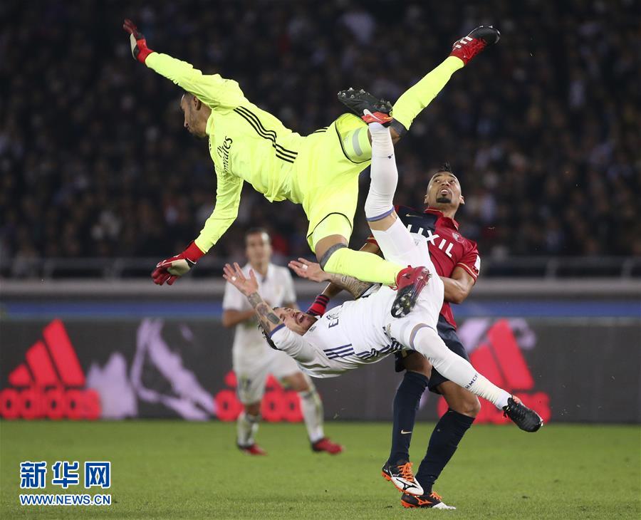 12月18日,皇家馬德里隊球員拉莫斯(下)、守門員納瓦斯與鹿島鹿角隊球員法布里西奧拼搶時撞在一起。新華社/美聯