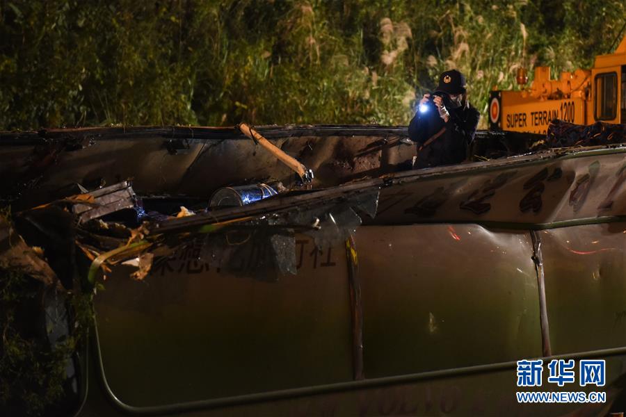 2月14日,工作人員在事故車輛內取證。據臺灣消防部門2月14日零時許發布的消息,13日晚發生的翻車事故已造成32人死亡,受傷的12人已全數送醫。新華社記者從臺灣公路警察部門獲悉,游覽車上沒有大陸游客。臺北市消防局通報,13日21時6分許,在臺灣公路主干道5號南港系統交流道接3號南下路段,臺北市蝶戀花公司一輛游覽車翻覆于引道邊坡,車內共44人(游客42人,導游、司機各1人),其中死亡32人(30人未送醫,2人送醫后不治),12人送醫持續治療中。新華社記者 歐東衢 攝
