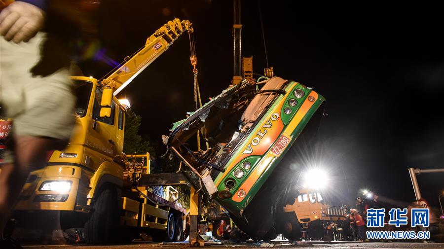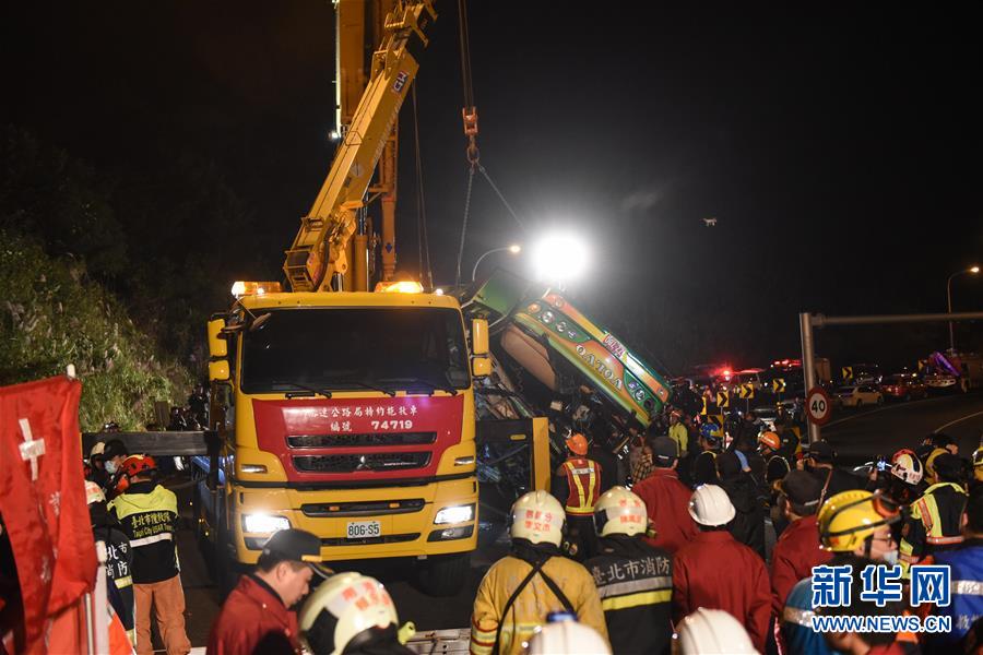 2月14日,事故車輛被吊車吊起。據臺灣消防部門2月14日零時許發布的消息,13日晚發生的翻車事故已造成32人死亡,受傷的12人已全數送醫。新華社記者從臺灣公路警察部門獲悉,游覽車上沒有大陸游客。臺北市消防局通報,13日21時6分許,在臺灣公路主干道5號南港系統交流道接3號南下路段,臺北市蝶戀花公司一輛游覽車翻覆于引道邊坡,車內共44人(游客42人,導游、司機各1人),其中死亡32人(30人未送醫,2人送醫后不治),12人送醫持續治療中。新華社記者 歐東衢 攝